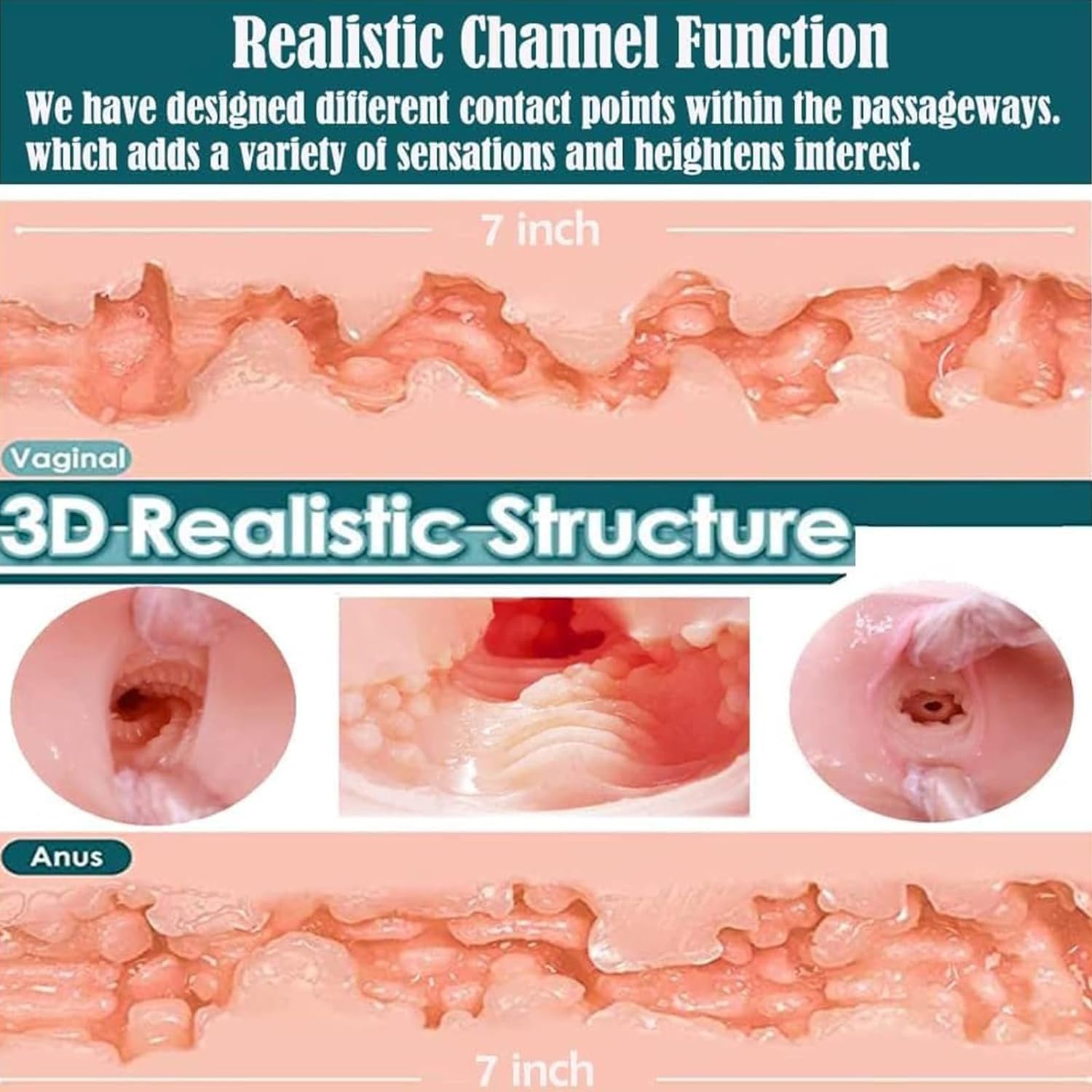 - Our male sex toy features a variety of stimulating Passage that snugly wrap around your intimate areas, creating a pleasurable sensation with every movement. Crafted to simulate a realistic female physiology. This alluring design offers two separate tight vaginal and anal cavities, each providing a unique suction sensation.